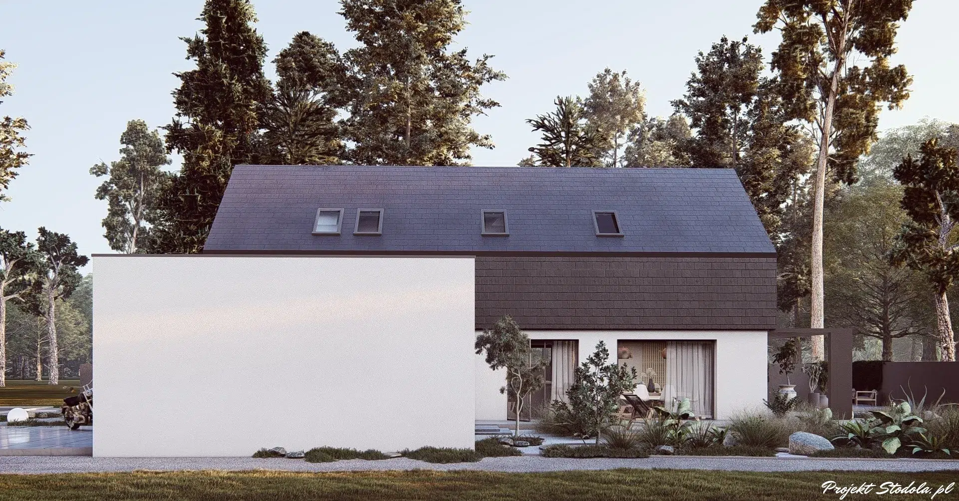 Garaż podziemny przede wszystkim pozwala oddzielić strefę techniczną od przestrzeni reprezentacyjnej domu. Samochody, rowery, narzędzia czy sprzęt ogrodniczy nie dominują wizualnie nad elewacją budynku, ponieważ cała funkcja garażowa zostaje przeniesiona poniżej poziomu terenu. Dzięki temu bryła domu może pozostać czysta, prosta i pozbawiona dodatkowych bram garażowych, które często stanowią dominujący element frontowej elewacji. Z punktu widzenia codziennego użytkowania oznacza to większy porządek przestrzenny oraz możliwość bezpośredniego przejścia z garażu do części mieszkalnej bez narażania się na warunki atmosferyczne.